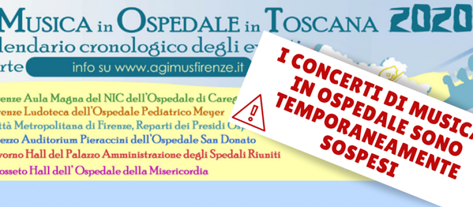 I concerti previsti nei giorni: 5 e 19 aprile presso l’ospedale di Careggi a Firenze, 5 aprile presso l’ospedale di Livorno, 19 aprile presso l’Ospedale di Arezzo organizzato assieme ad Associazione Le 7 Note e i concerti all’Ospedale Misericordia di Grosseto, quindi, non si terranno.