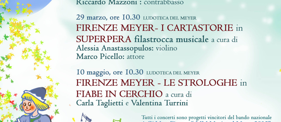Pubblicato in MM - Musica al Meyer, Post in evidenza, Ultimi appuntamenti da Luca Provenzani • 22 Marzo 2015Musica al Meyer 2015 IV edizione Ospedale Pediatrico Meyer, viale Pieraccini 24 Firenze 15 febbraio ore 10,30 Ludoteca del Meyer PREZZEMOLINA fiaba musicale a cura di Elisabetta Furini, chitarra e voce recitante e Riccardo Mazzoni, contrabbasso 29 marzo ore 10,30 Ludoteca del Meyer I CARTASTORIE in...
