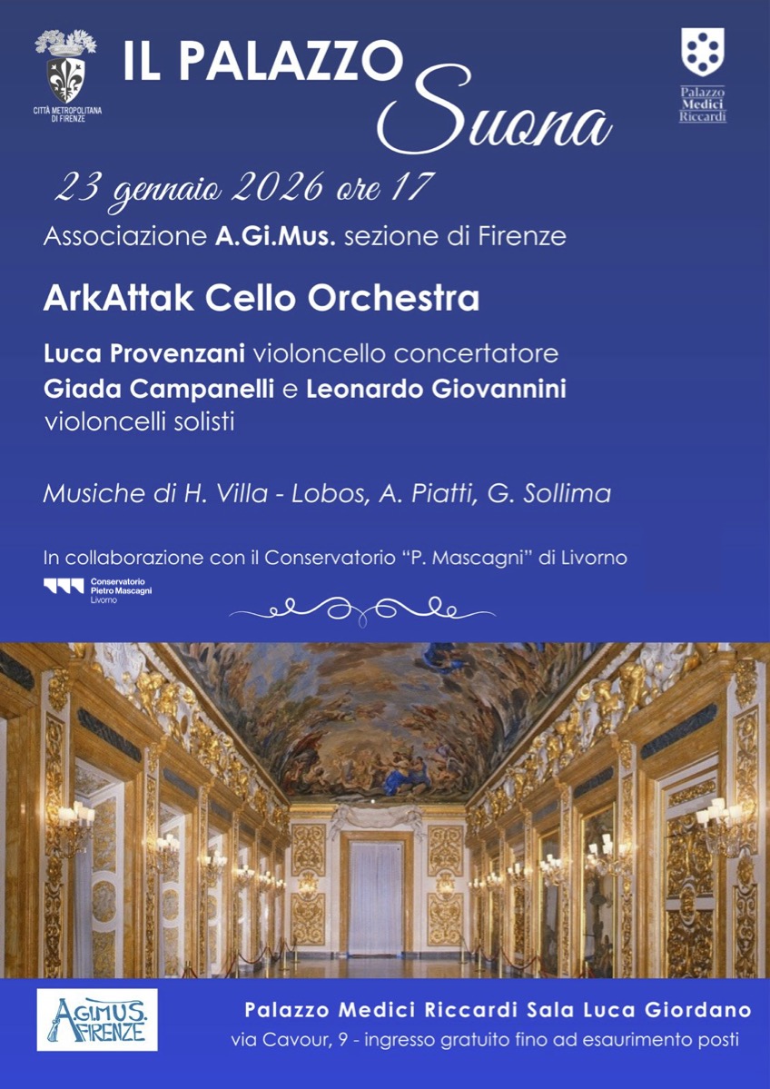 Venerdì 23 gennaio, ore 17.00, presso la meravigliosa Sala Luca Giordano di Palazzo Medici Riccardi, nella rassegna “Il Palazzo Suona”, si esibirà ArkAttak Cello Orchestra, l’orchestra di violoncelli guidata da Luca Provenzani. In veste di solista suoneranno Leonardo Giovannini e Giada Campanelli, con musiche di Villa Lobos, Piatti, Sollima, Queen.