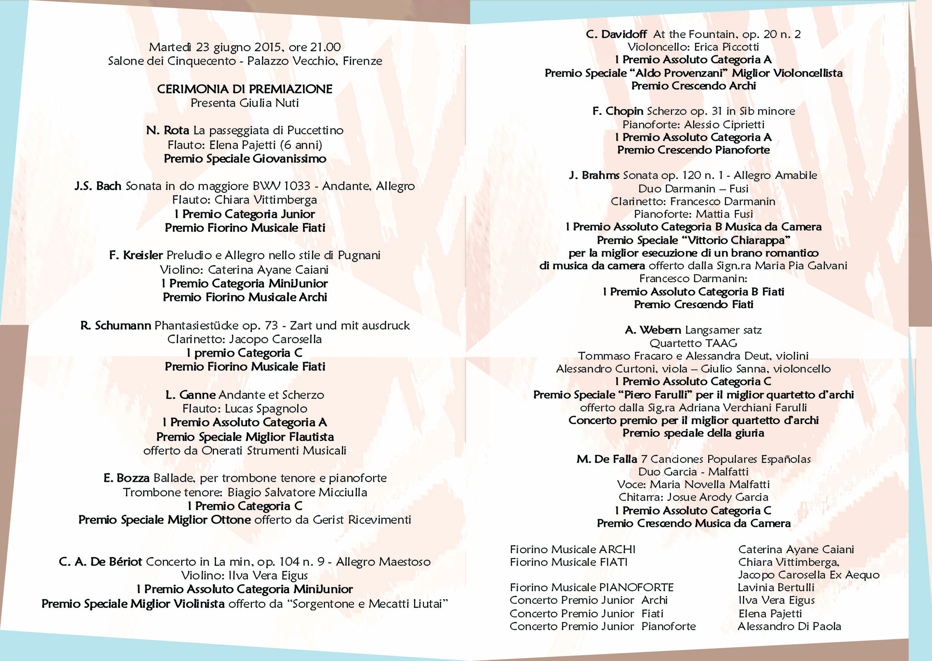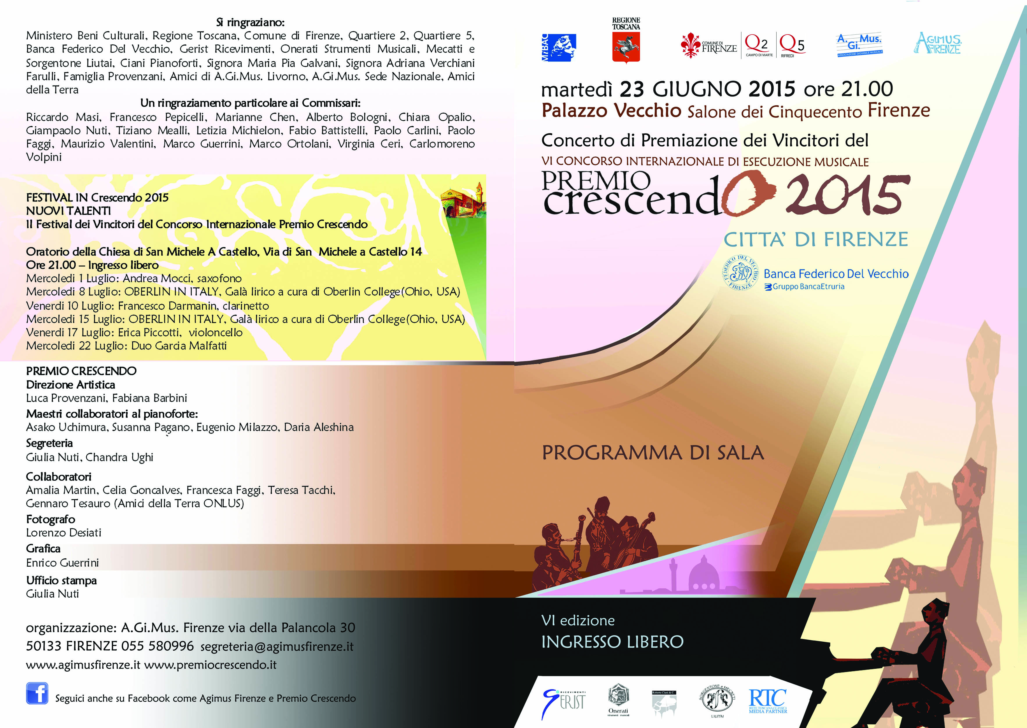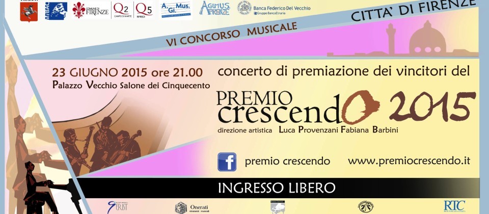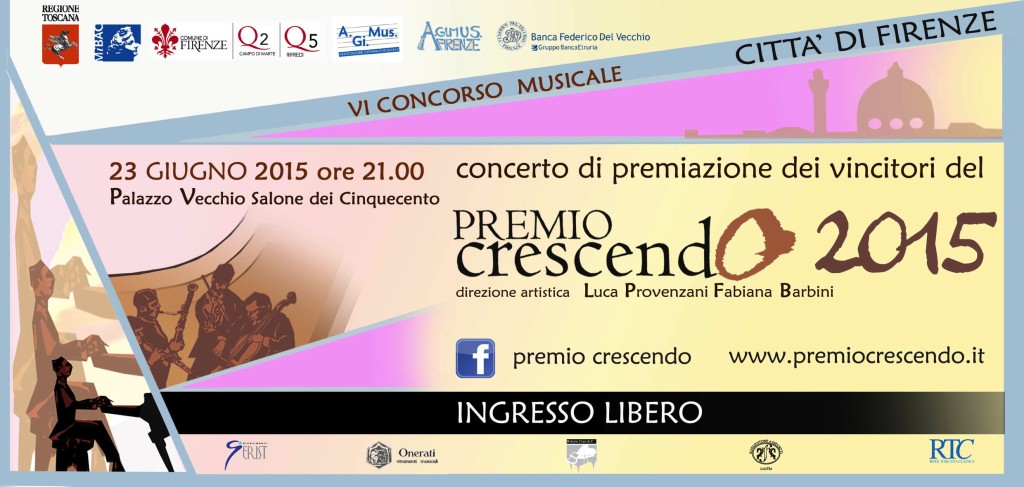 Si esibiranno in concerto tutti i vincitori della VI edizione del concorso internazionale di esecuzione musicale “Premio Crescendo – città di Firenze”, giovani musicisti entro i trent’anni di età che partecipano al concorso nelle sezioni di archi, fiati, musica da camera e pianoforte.