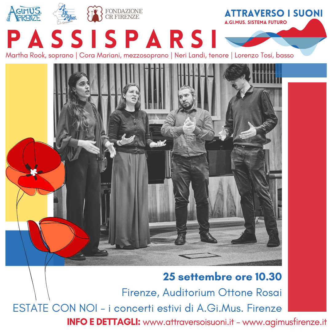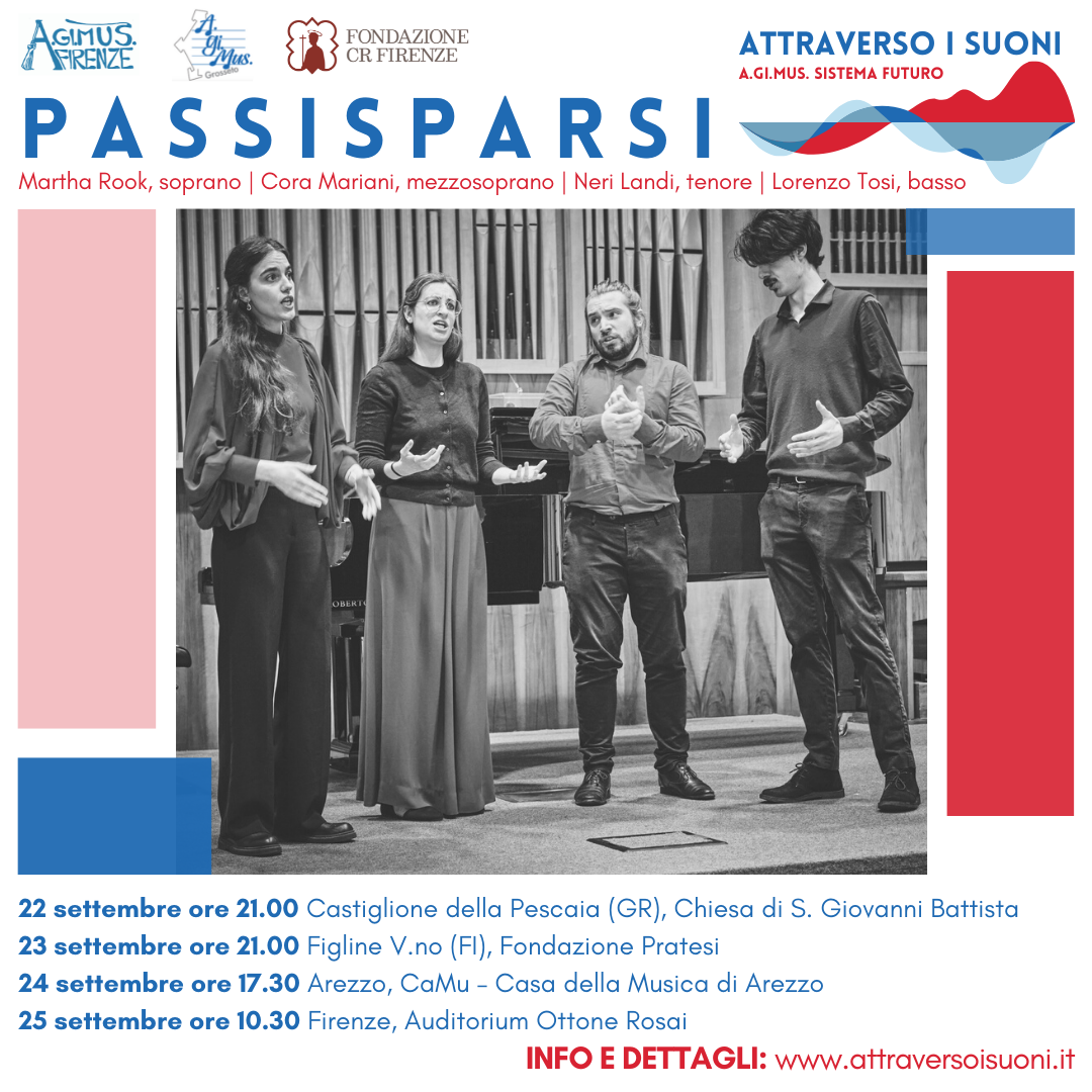 PassiSparsi è un giovane ensemble vocale rinascimentale nato nel 2019. Il loro primo programma, dal titolo “Cantar per scherzo”, interamente dedicato alla raccolta Libro de villanelle, moresche et altre canzoni in lingua italiana di Orlando di Lasso è stato selezionato nel 2021 dall’associazione L’Homme Armé per essere eseguito nell’ambito del festival “FloReMus” e da Auser Musici per il “Festival Toscano di Musica Antica”. Nel 2020 PassiSparsi presenta un nuovo programma “Passi Sparsi, fra scherzo e languore” intorno ai primi madrigalisti italiani a Palazzo Pitti. L’ensemble ha partecipato a masterclass con con Walter Testolin e Jill Feldman. Nel mese di aprile 2021 l’ensemble risulta finalista nella sezione musica antica del concorso nazionale “Premio delle Arti”, edizione 2020. Nel settembre 2020 il gruppo si dedica alla registrazione audio-video di alcuni madrigali di Vincenzo Galilei, un progetto del Museo Galileo di Firenze in collaborazione con il conservatorio L. Cherubini per il 500° anniversario della nascita del grande teorico e musicista, padre di Galileo. Nel settembre 2021 l’ensemble partecipa al concerto/conferenza organizzato dal museo “Vincenzo Galilei, Dante, e la musica” nella cornice di Santa Maria a Monte (PI). Nel gennaio 2021 il gruppo presenta il programma “Canti d’amore, gioia e nostalgia nell’Europa Rinascimentale” con musiche di tradizione europea per il concerto streaming di Capodanno organizzato dal Conservatorio L. Cherubini e Quartiere 2 di Firenze. Nell’ottobre 2021 PassiSparsi si esibisce con programma sacro a tema Mariano per il festival “I luoghi dello spirito e del tempo” organizzato da Collegium Musicum Classense per i festeggiamenti “VIVA DANTE 700”. Il concerto si conclude con una prima esecuzione assoluta del brano “Umile ed alta” del compositore contemporaneo Damiano Ferretti. Nello stesso periodo l’ensemble presenta il proprio programma a tema dantesco “Risonavan per l’aere sanza stelle”, un dialogo musicale tra l’Inferno di Dante e il madrigale rinascimentale, eseguito alla Certosa di Firenze. Nel gennaio 2022 PassiSparsi collabora l’ensemble Cappella di Santa Maria degli Angiolini sotto la direzione di Gian Luca Lastraioli per il concerto “Torneo Amoroso. Villanelle giocose del Cinquecento italiano”, all’interno de “La Stagione del Cocomero”, Teatro Niccolini di Firenze. Nel marzo 2022 PassiSparsi è invitato da Early Music in Latvia a partecipare a una residenza artistica, presentando il programma “In amoroso Foco” in due concerti, al Castello di Bauska (Lettonia) e al palazzo di Raudondvaris (Lituania). Il 30 aprile 2022 l’ensemble si esibisce all’interno del cartellone del festival “Lucca Classica” per una visita botanica e concerto nei giardini di Villa Reale a Marlia.
