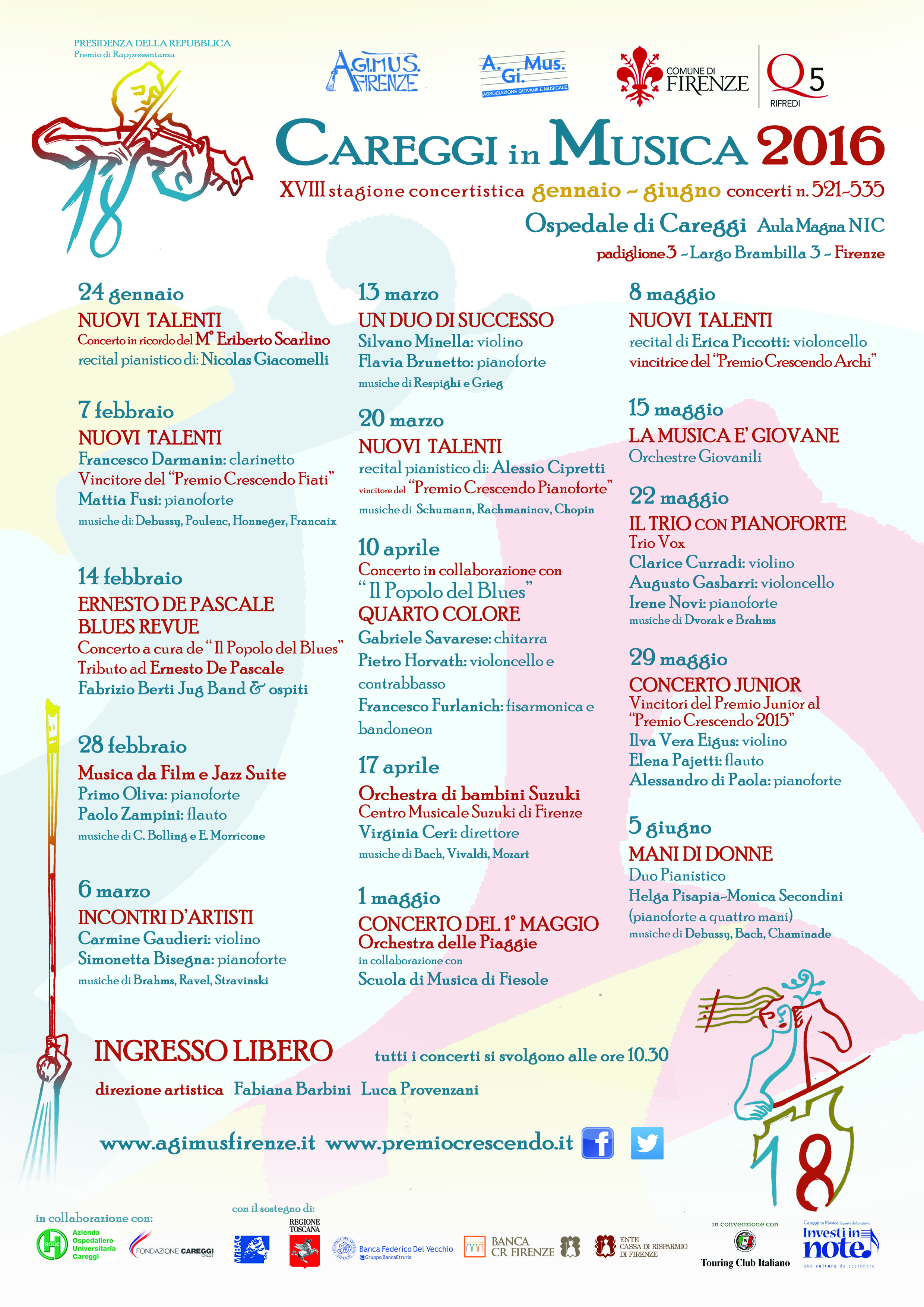 “Careggi in Musica” diventa maggiorenne. Dal 24 gennaio torna la stagione di musica in ospedale organizzata da A.Gi.Mus. Firenze e Azienda Ospedaliero Universitaria Careggi, che quest’anno raggiunge il traguardo della diciottesima edizione. L’iniziativa ha la doppia finalità di creare una proposta culturale per il territorio e offrire un’ora di svago ai degenti del nosocomio fiorentino e ai loro familiari.