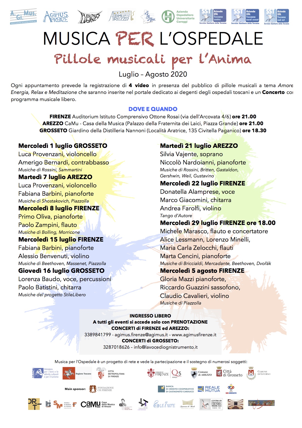 Abbiamo cercato di attivarci il più velocemente possibile per portare un po’ di musica a chi passerà l’estate in città e con questa lettera siamo quindi a presentarvi il calendario dei nostri concerti estivi a Firenze, Arezzo e Grosseto (questi ultimi a cura della sezione A.Gi.Mus. di Grosseto).